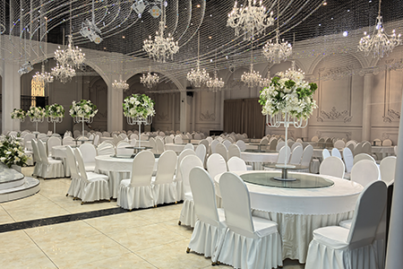 迪奧宮殿壹號廳:面積大,可容納60多桌,以香檳色為主色調,適合大型婚禮,且支持婚車開進現(xiàn)場,增加儀式感。